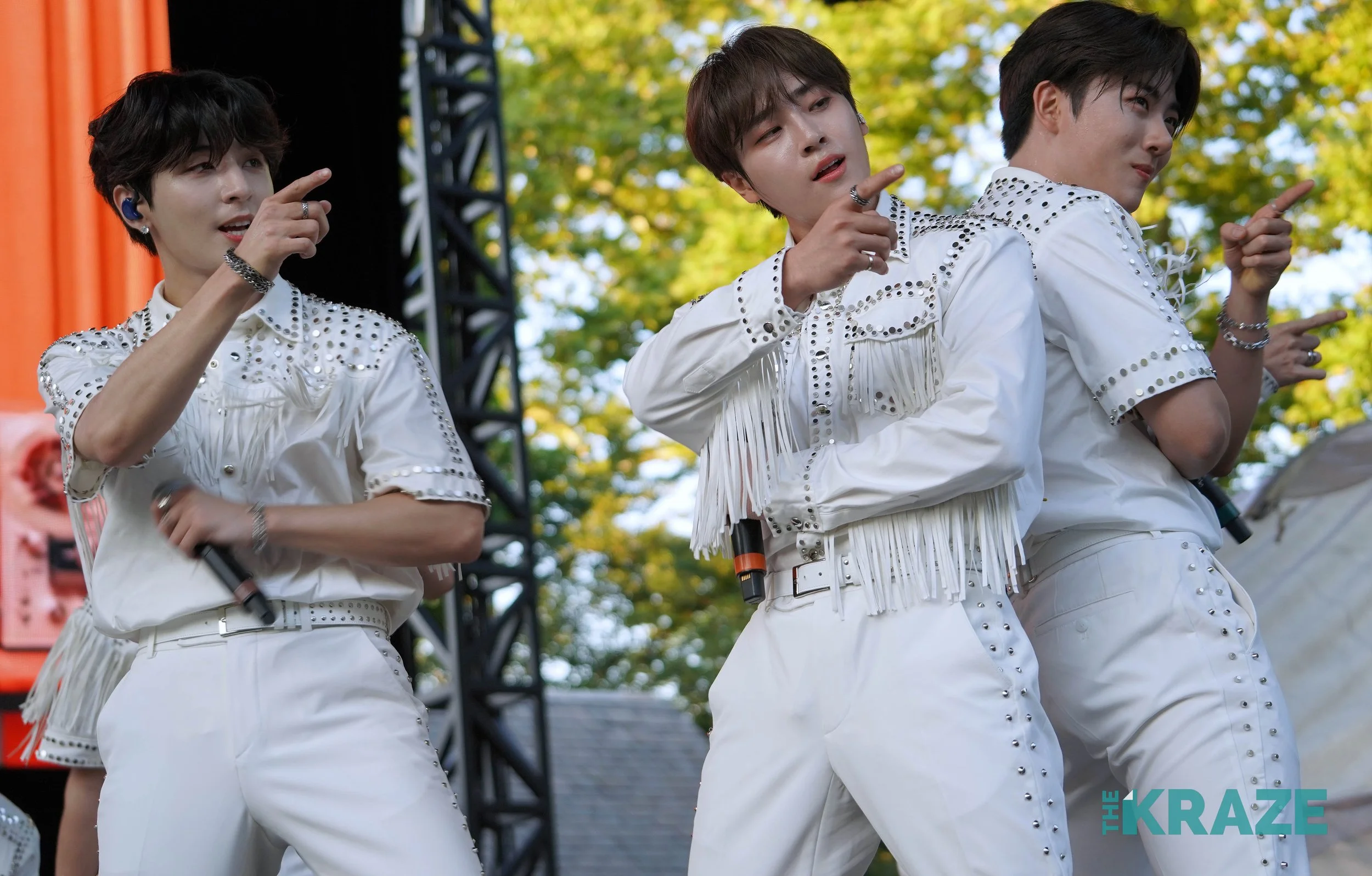 Golden Child took the stage and opened with “Burn It,” The title song to their fifth mini-album [YES.]. Dressed sharply in white with studs and fringe, they came on stage and immediately jumped into choreography. In sync, they moved like veterans on the stage as they migrated seamlessly between formations. “Fanfare” followed as they gave their all on the hot stage. Holding mics, the guys had no problem getting the crowd energized.