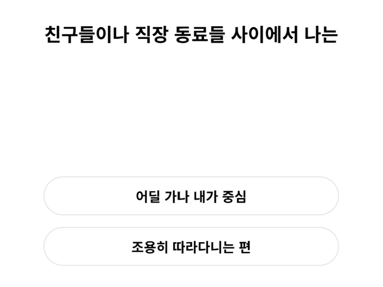 “Among my friends and colleagues, I: A. Am the center-of-attention; B: Follow along quietly.” A question from one of many Teto-Egen quizzes, found at: https://www.metavv.com/ko/content/10926153